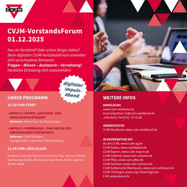 Neu im Vorstand? Oder schon länger dabei? Beim digitalen CVJM-VorstandsForum erwarten dich verschiedene Elemente.